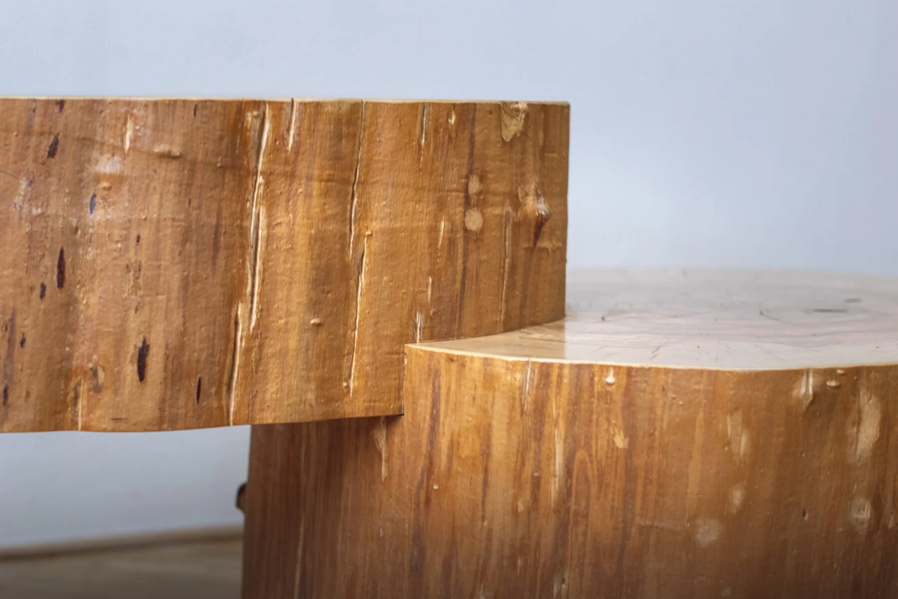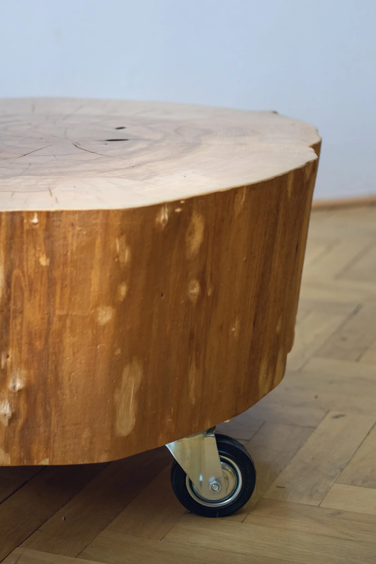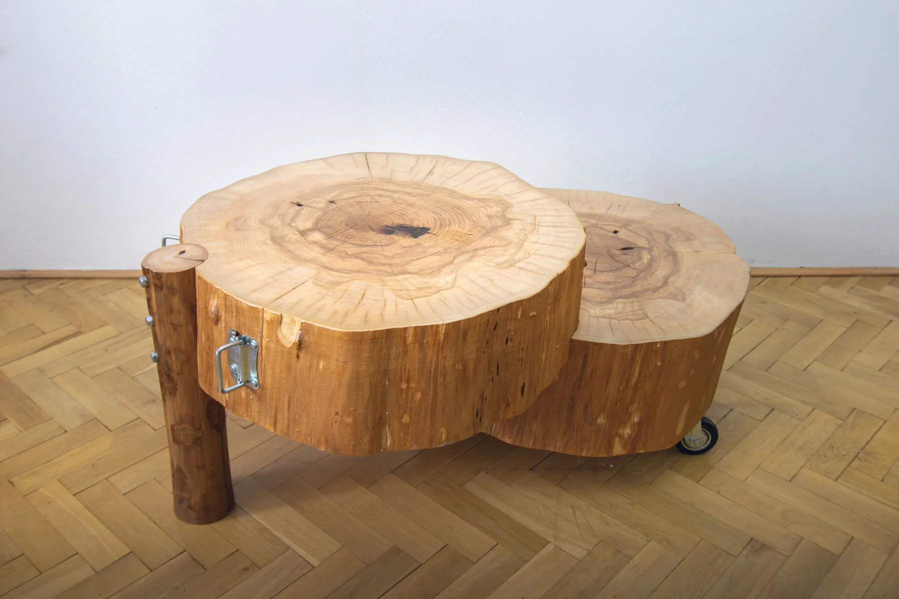 Spojením dvoch diagonálne rezaných masívnych koláčov zo starého jaseňového kmeňa sme vytvorili dvojpodlažný konferenčný stolík. Jeho povrch sme vyleštili a ošetrili olejom, čím sa zvýraznila štruktúra dreva.