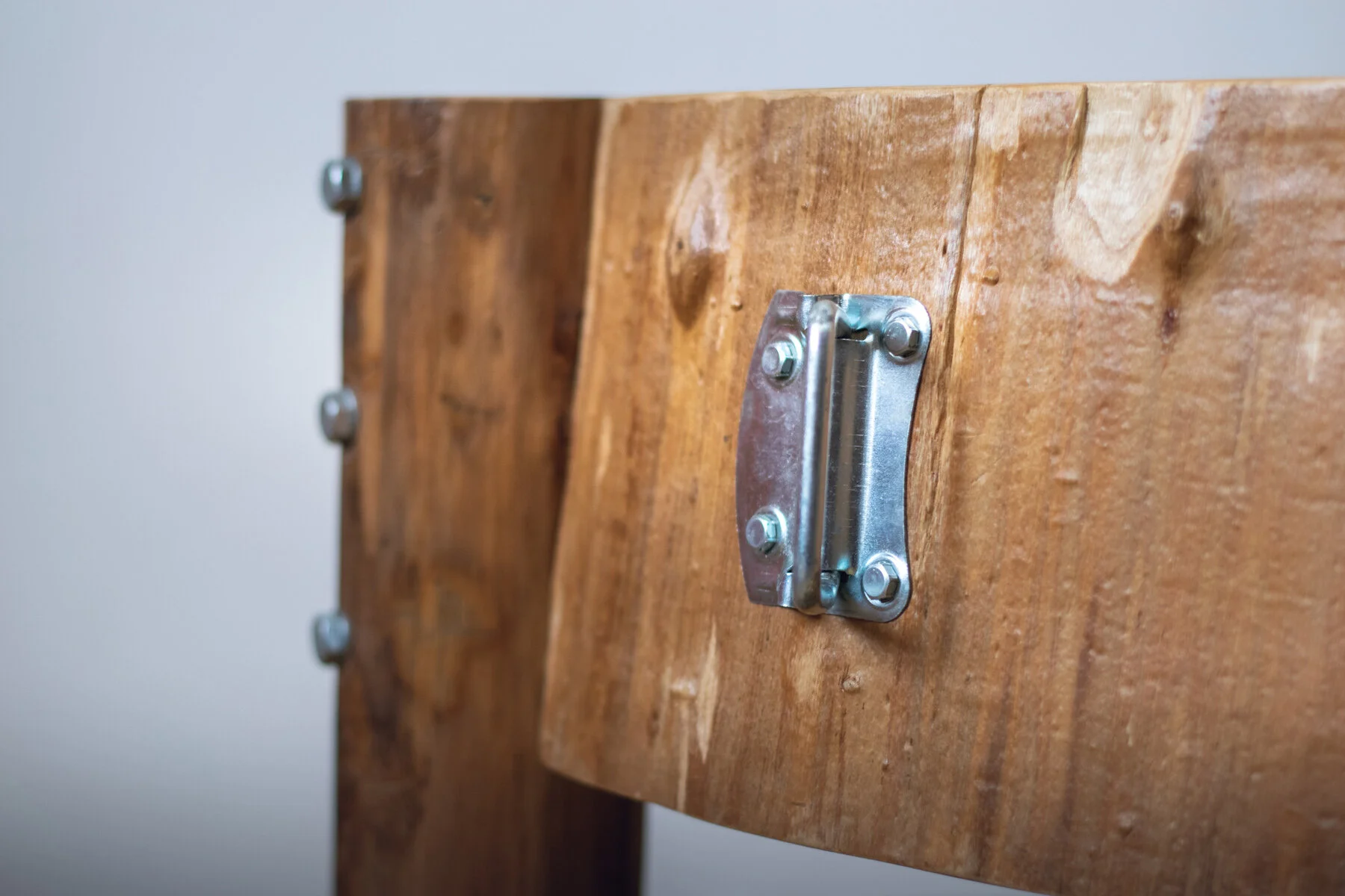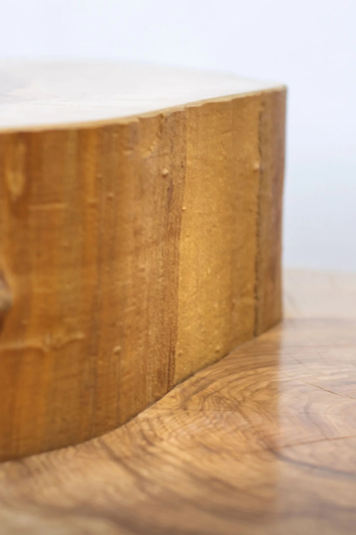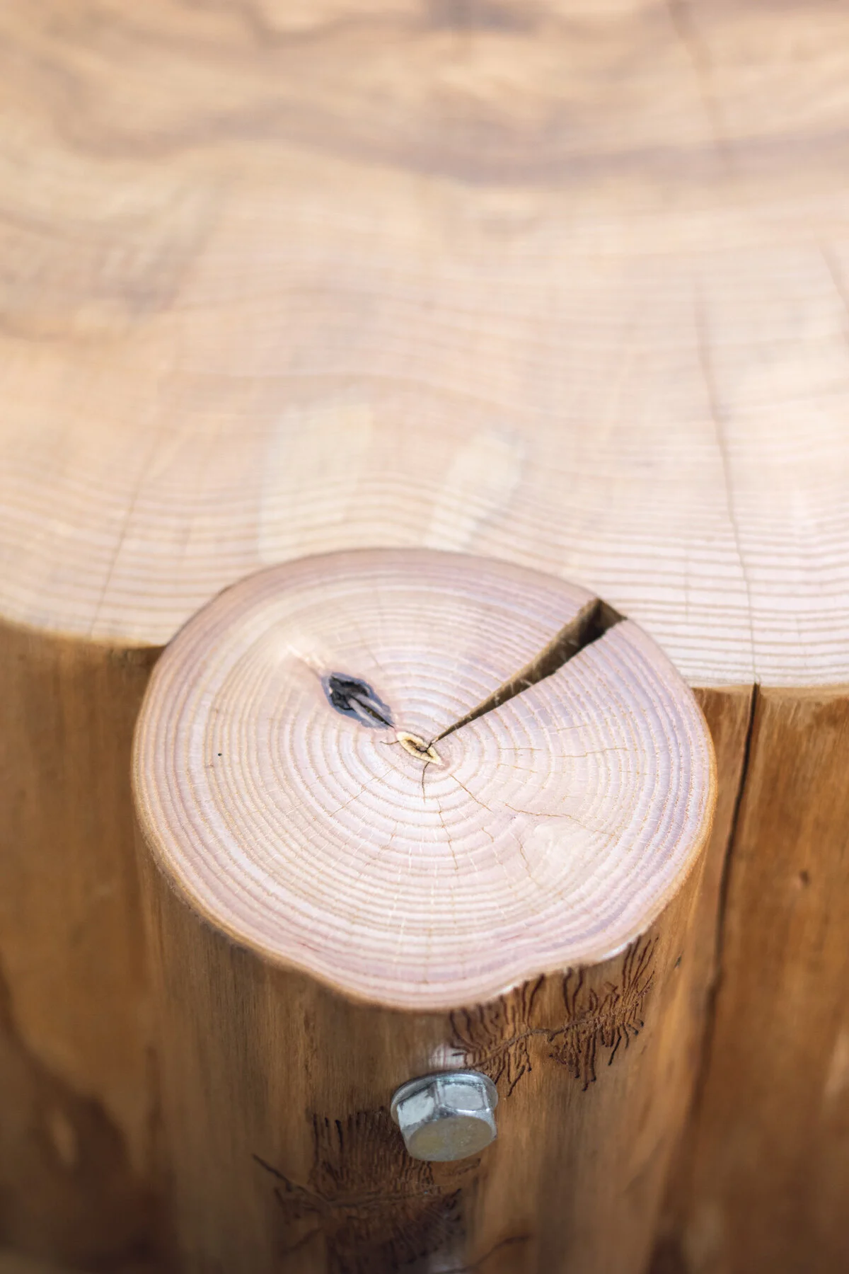 Spojením dvoch diagonálne rezaných masívnych koláčov zo starého jaseňového kmeňa sme vytvorili dvojpodlažný konferenčný stolík. Jeho povrch sme vyleštili a ošetrili olejom, čím sa zvýraznila štruktúra dreva.